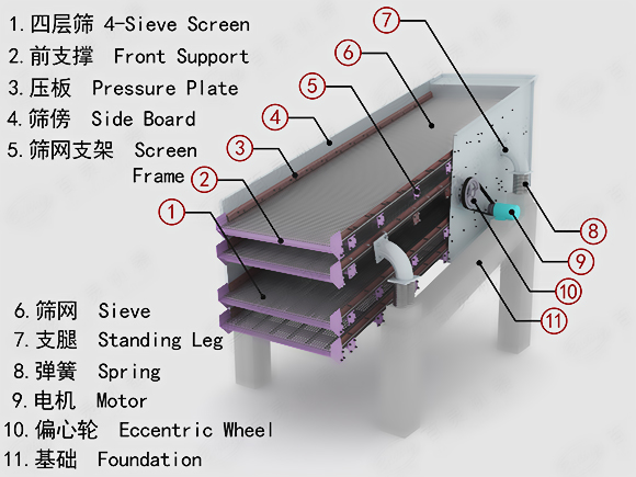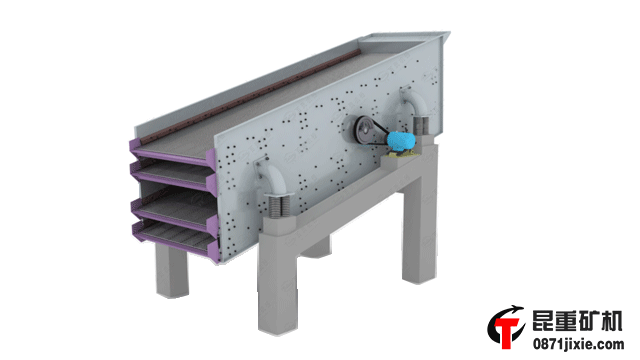 圓振動篩工作時,電動機經(jīng)傳動器使激振器偏心塊產(chǎn)生高速旋轉。運轉的偏心塊產(chǎn)生很大的離心力,激發(fā)篩箱產(chǎn)生一定振幅的圓運動,篩上物料在傾斜的篩面上受到篩箱傳給的沖量而產(chǎn)生連續(xù)的拋擲運動,物料與篩面相遇的過程中使小于篩孔的顆粒透篩,從而實現(xiàn)分級。